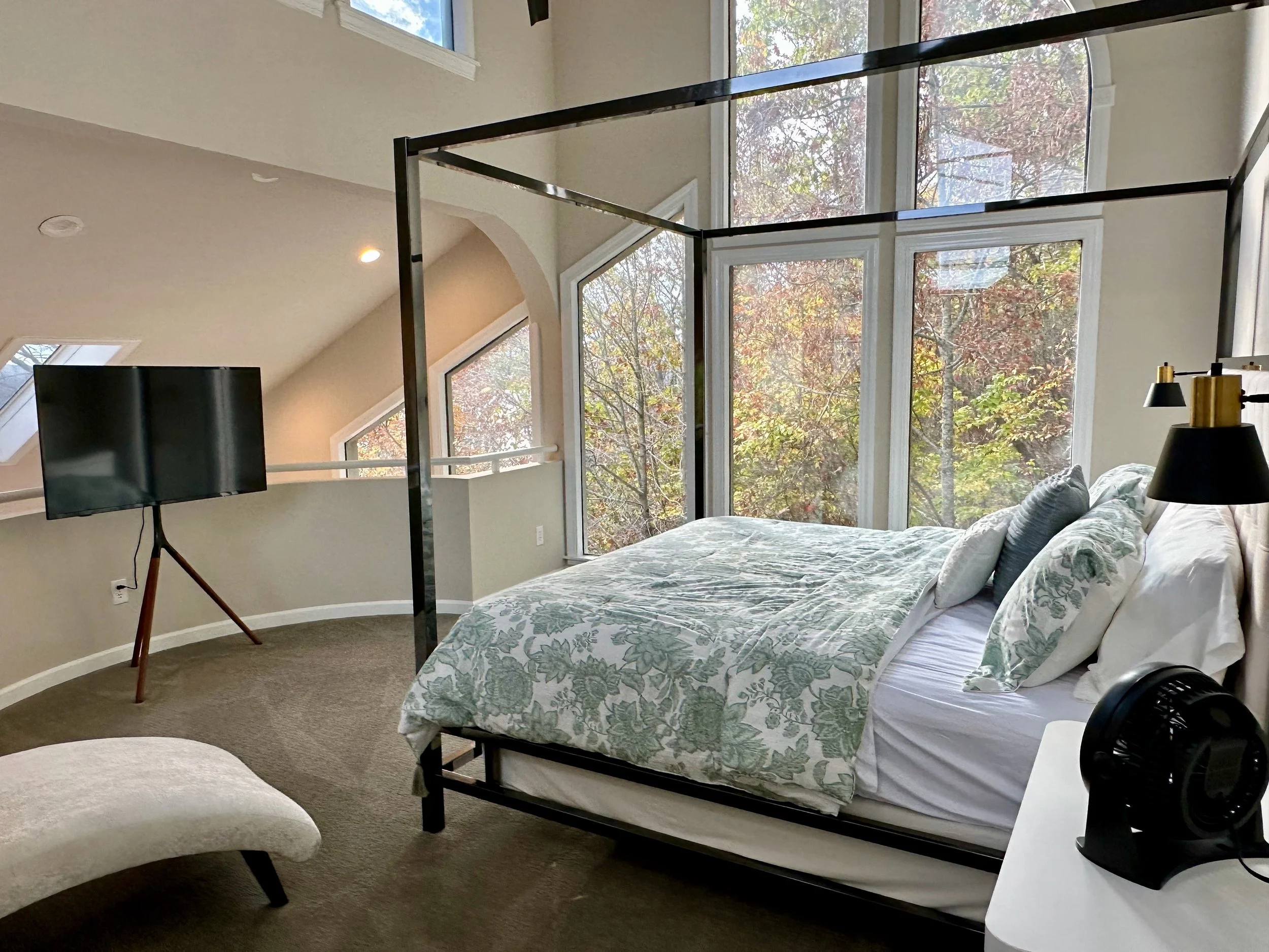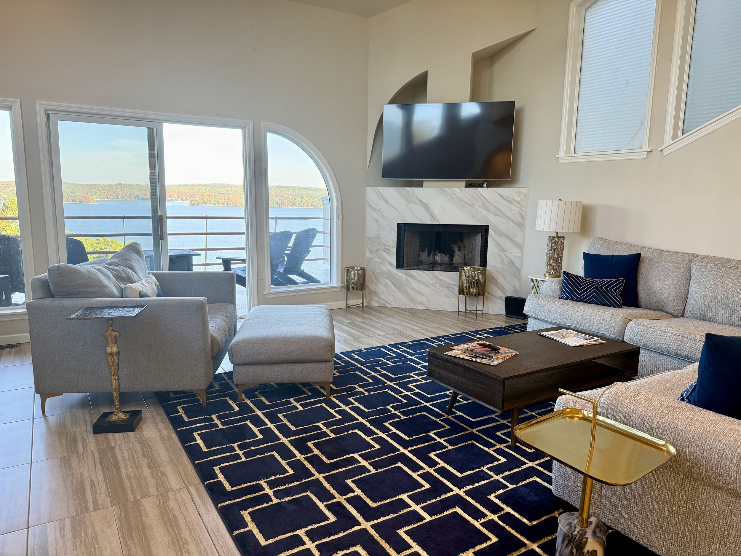"The place is gorgeous, and the view is spectacular. The wall facing the lake in both the living room and in a downstairs bedroom is almost entirely windows plus a sliding door with a balcony. We loved that."