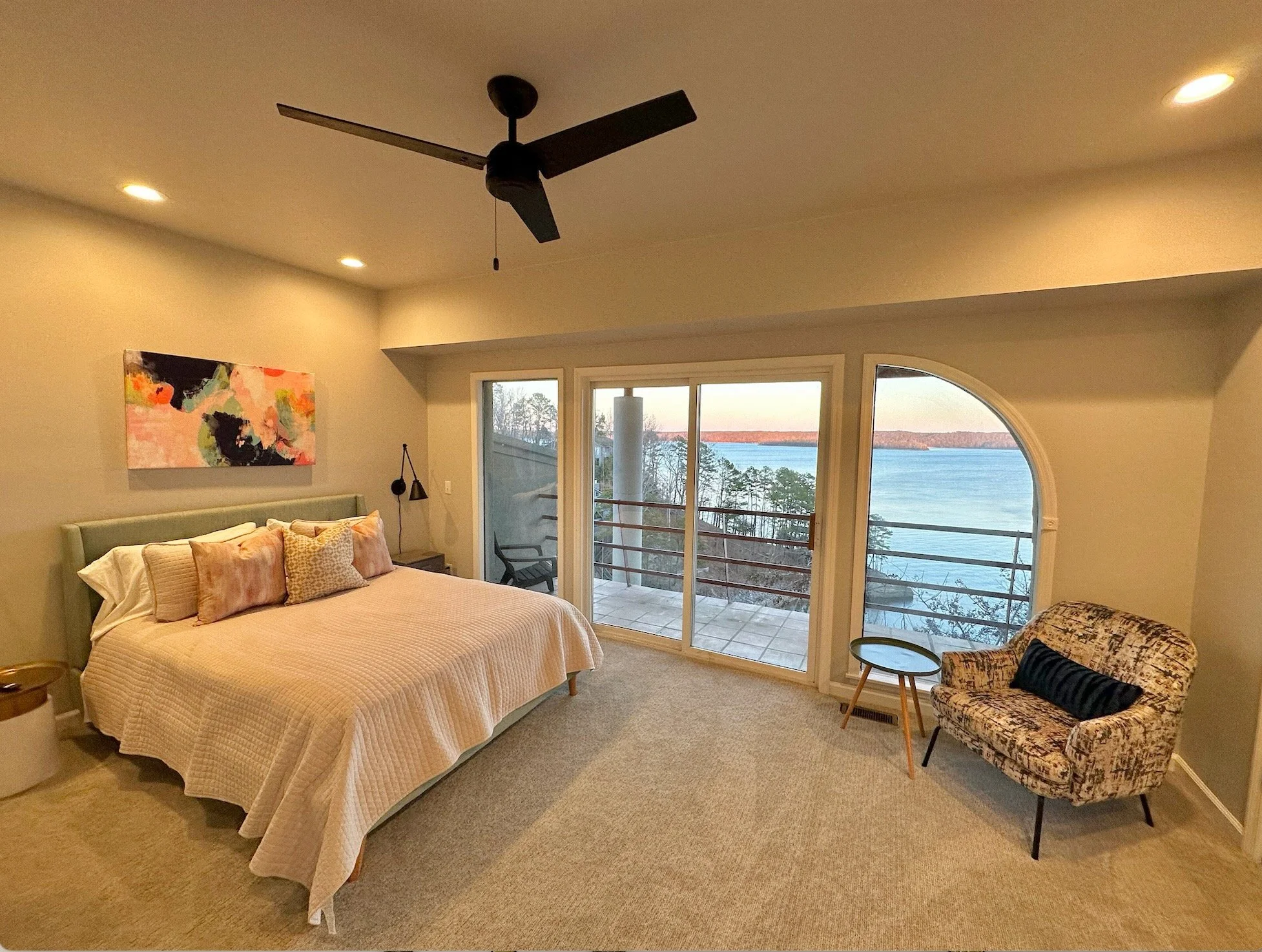 "The place is gorgeous, and the view is spectacular. The wall facing the lake in both the living room and in a downstairs bedroom is almost entirely windows plus a sliding door with a balcony. We loved that."